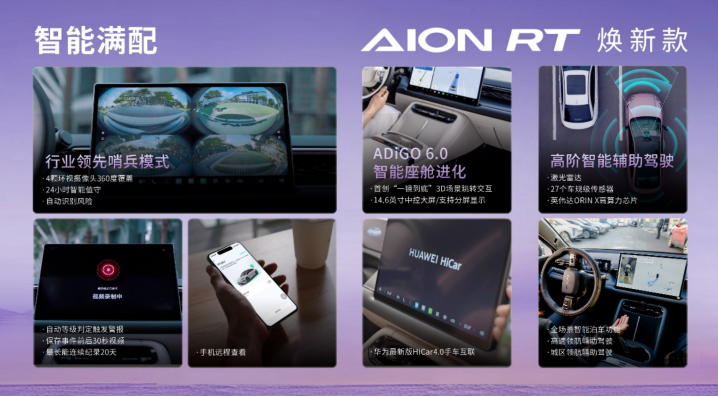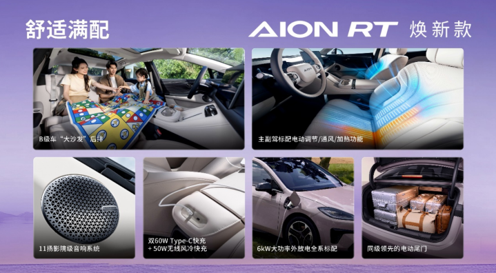 在照顾前后排家人不同需求上,AION RT焕新款堪称典范。新车标配ADiGO 6.0智能座舱,首创了“一镜到底”的3D交互,并提供14.6英寸中控屏分屏操作,,可以开启高速领航辅助的同时查看导航信息。兼容华为HiCar与Carlink互联,带来更多流畅的通信、娱乐等丰富智能生态,兼顾了主副驾的不同需求。后排标配双60W Type-C快充接口,可以同时给2台电脑或手机充电,让后排家人的娱乐、工作不断电。此外,双电动遮阳帘、50W无线快充、电动尾门及11扬声器音响系统等配置,都体现出对全车乘员需求的细致考量。
