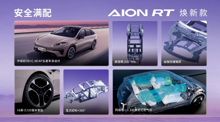 安全是家庭用车的基础。AION RT焕新款采用中保研3G+C-NCAP五星安全标准设计,高强钢占比达74%,配合笼式车身结构和360°加强防撞钢梁,为乘员提供全面保护。
